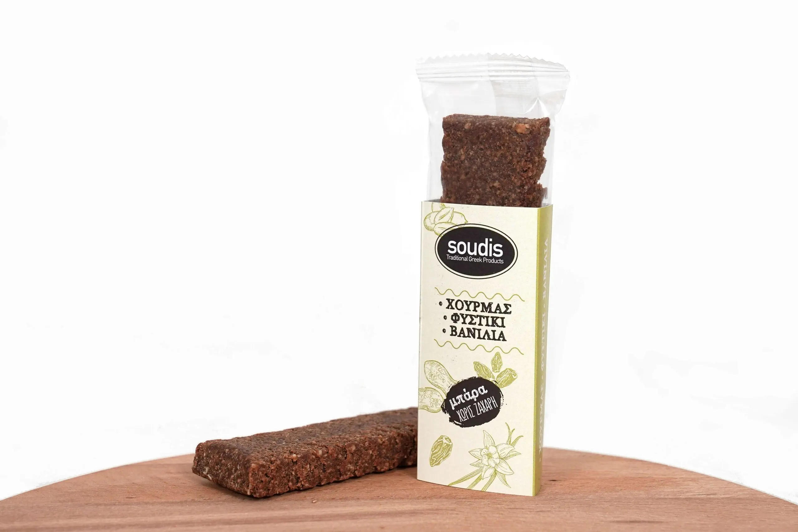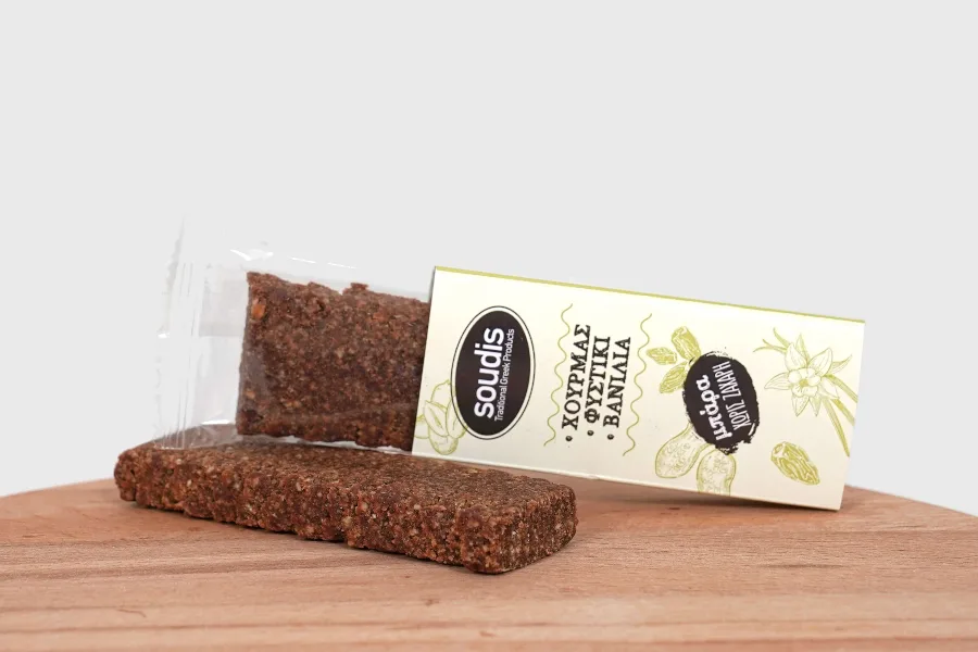 Μπάρα με χουρμά ως κύριο συστατικό και γεύση φυστίκι σε συνδυασμό με βανίλια χωρίς προσθήκη ζάχαρης.